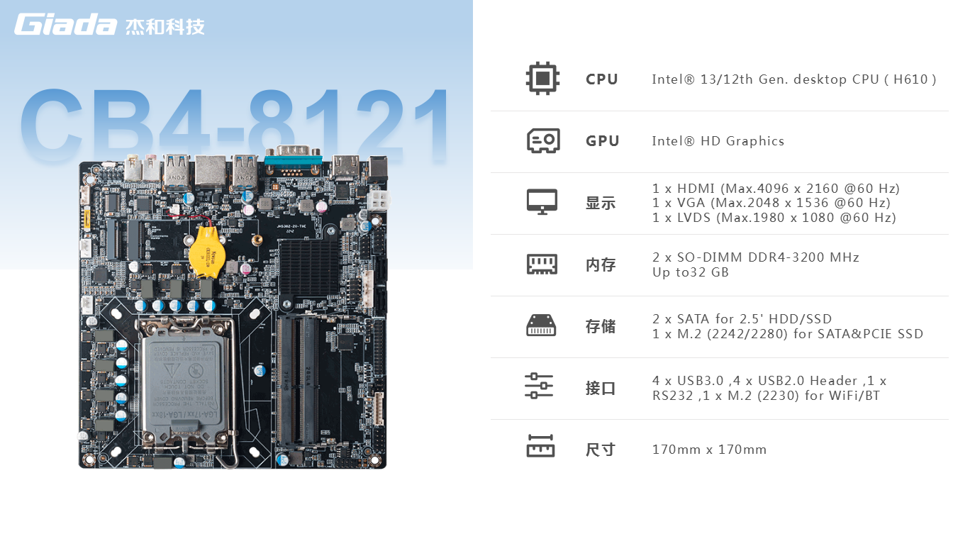另外,一体机相对于传统的电脑更加美观,更加节能环保,而且一体机在使用体验方面也有独特的优势:比笔记本屏幕大,比台式机更简洁,也解决了一直为人诟病的台式机线缆多而杂的问题,因此,越来越多的教育办公、日常娱乐和学习的用户选择使用一体机。GiadaCA88(中国区)科技根据市场与客户需求,推出这款高性能的一体机专研主板CB4-8121,带来全新震撼体验。CA88(中国区)科技主板CB4-8121是基于Thinmini ITX一体机标准设计,采用Intel Alder Lake-S平台H610芯片组,支持全新第13/12代Core i7/i5/i3处理器,搭载双通道SO-DIMM DDR4-3200MHz内存、1 x M-Key M.2 (2242/2280) SSD和 2 x SATAIII存储,强大的配置能够为用户带来出色的计算和图形处理性能,无论是载入游戏、数据传输还是平面设计,赋予用户更加极致流畅的使用体验。