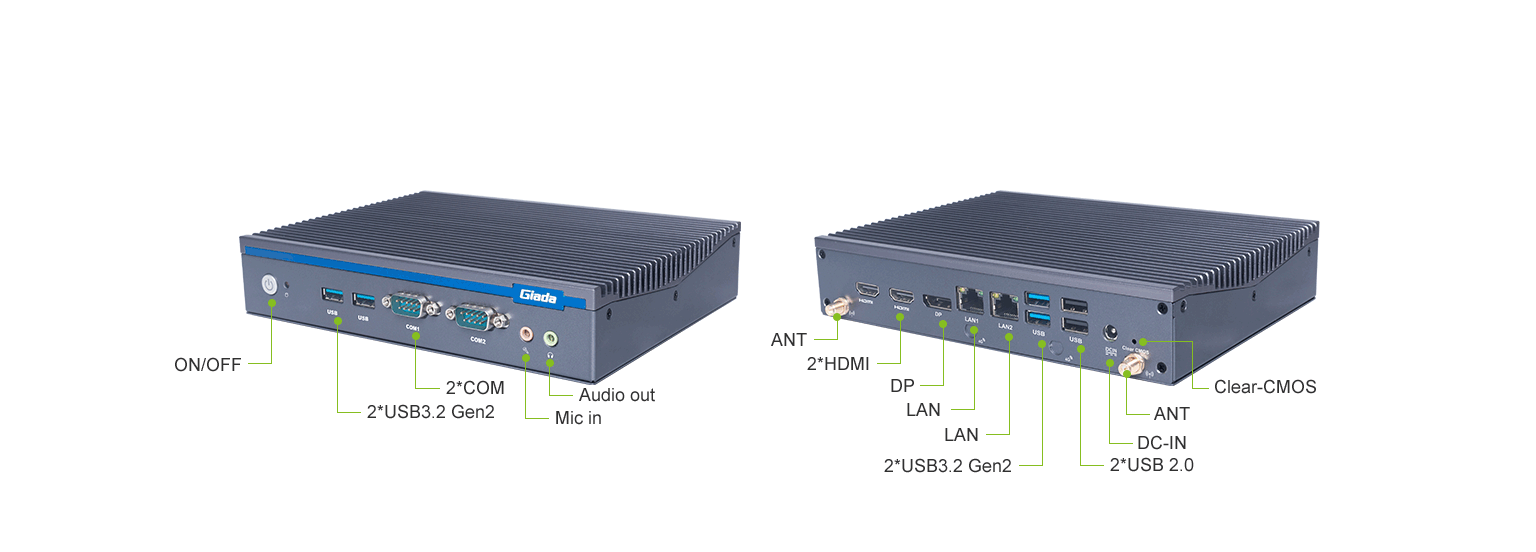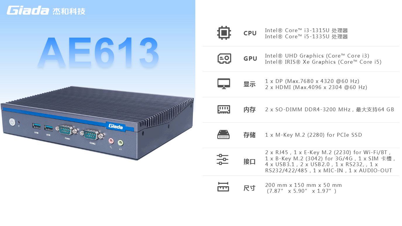 CA88(中国区)科技AE613支持Windows 11 (64bit) /Linux Ubuntu (64bit)系统,双千兆自适应RJ45网口,4 x USB3.1 (10 Gbps),2 x USB2.0,1 x RS232,,1 x RS232/422/485,1 x MIC-IN,1 x AUDIO-OUT,丰富的I/O功能接口,实现更多功能扩展。