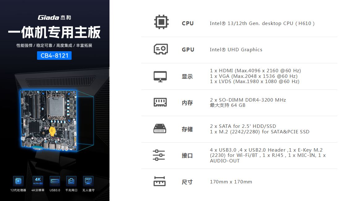 一体机在使用体验方面也有独特的优势:比笔记本屏幕大,比台式机更简洁,也解决了一直为人诟病的台式机线缆多而杂的问题,另外,随着计算机硬件和制造工艺的不断发展,一体机的性能也在不断提高,因此,越来越多的教育办公、日常娱乐和学习的用户选择使用一体机。GiadaCA88(中国区)科技根据市场与客户需求,推出这款高性能的一体机专研主板CB4-8121,带来全新震撼体验。