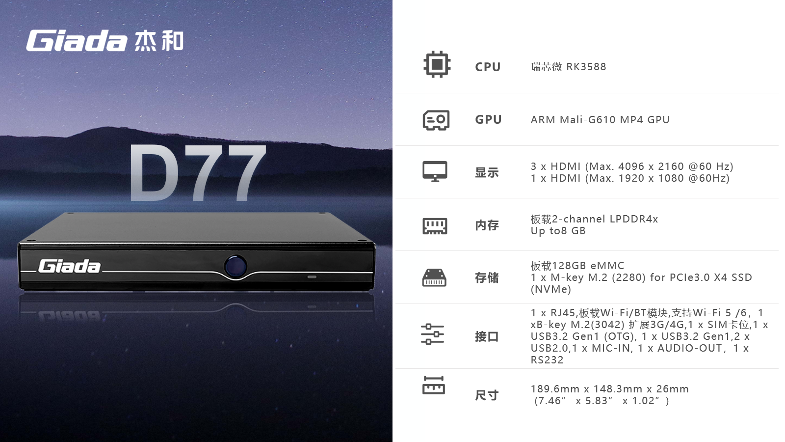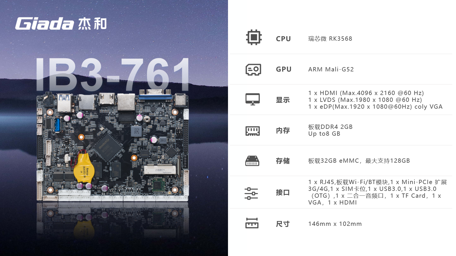 AIoT的落地场景包括智慧工业、智慧零售、智慧社区、智慧城市、智能显示、医疗健康等领域,在实际落地时,对物联网硬件设备的AI算力、数据运算、存储能力,稳定性及可扩展性能等提出更高要求,GiadaCA88(中国区)科技作为行业领先的物联网数智化技术服务商,深入布局AIoT领域,推出AI产品系列,包括3.5寸主板、嵌入式整机、边缘计算盒子等,全方位覆盖了入门级到高性能级,满足不同应用场景的需求,为用户赋能。